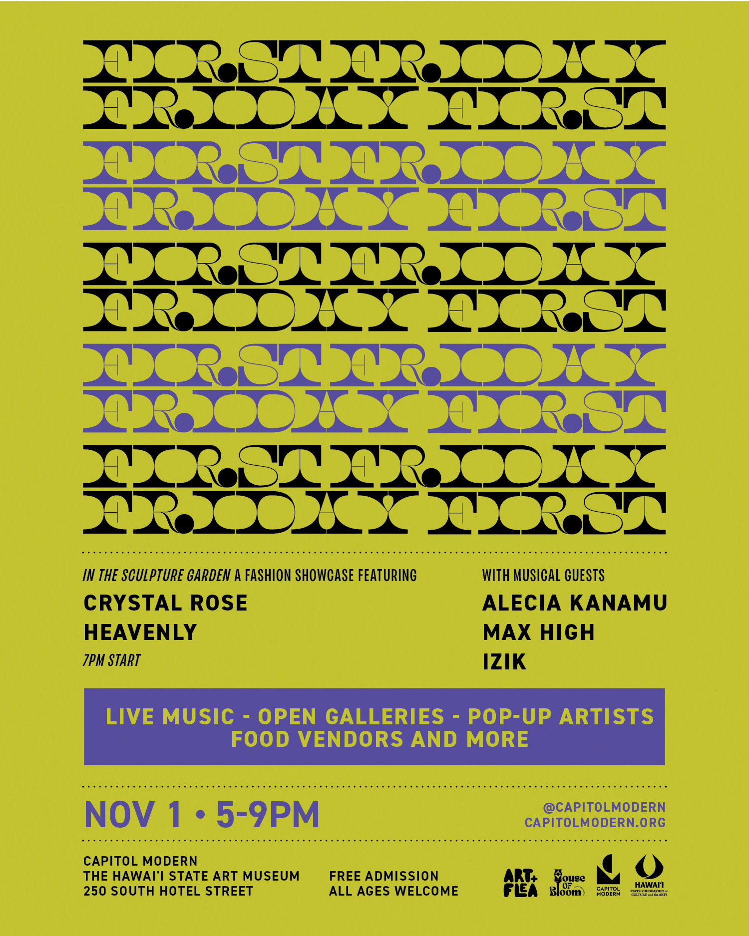 Fashion showcase with Crystal Rose and Heavenly, live music with Alecia Kanamu, Max High, and Izik; Art+Flea urban market.