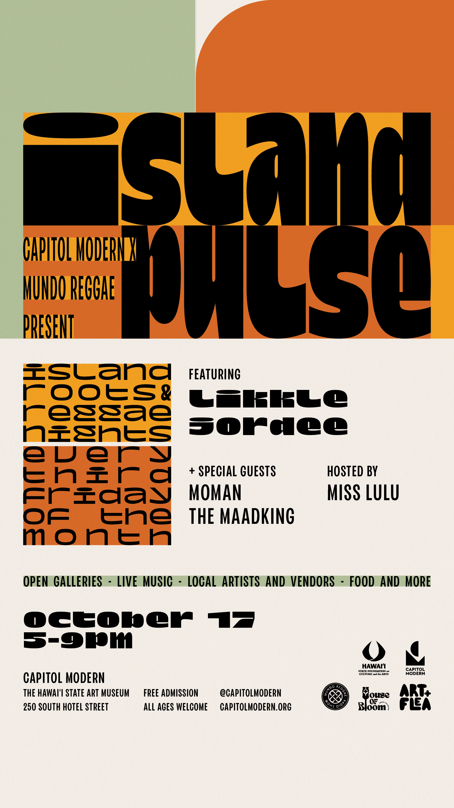 • Island Pulse, free all-ages evening of island reggae music and art. Friday October 17, 5:00 - 9:00 p.m.